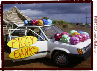 パイナップル畑を走っていたら突然現れたカラフルなブタたち。